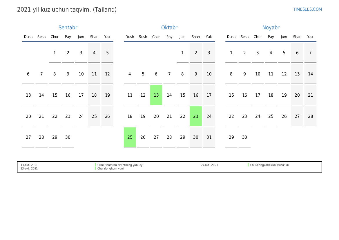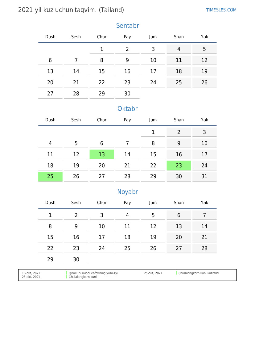 Tailand uchun 2021 yil kuz uchun ta'til va dam olish kunlari bilan PDF taqvimini yuklab oling va chop eting