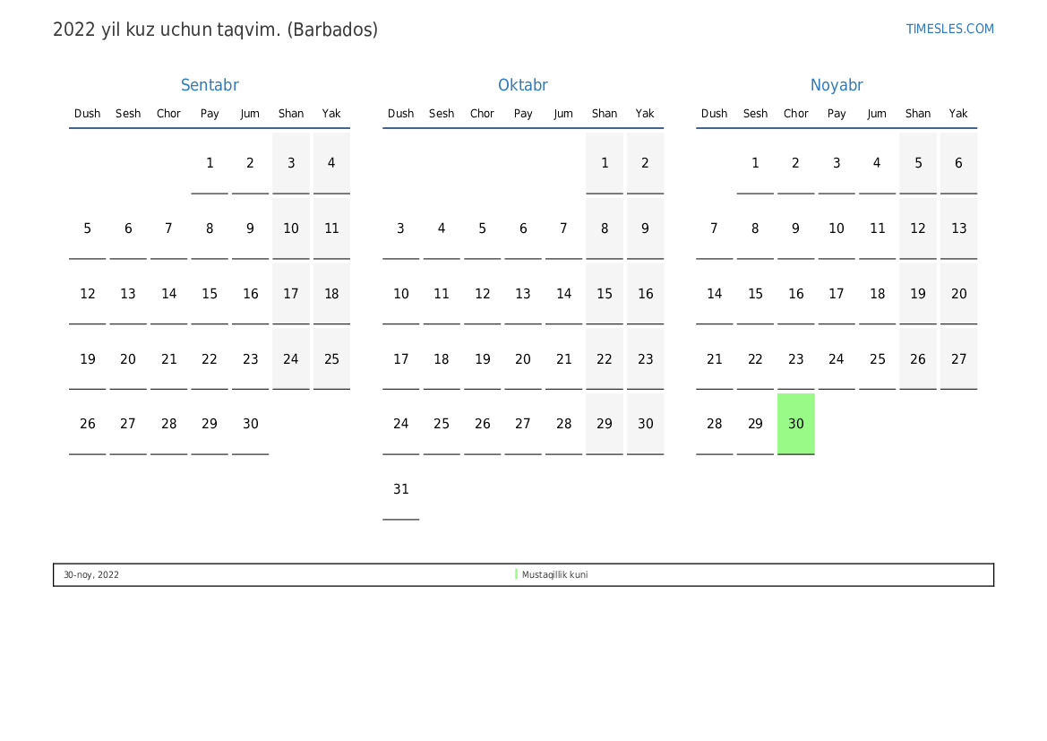 Barbados uchun 2022 yilgi kuz uchun taqvim