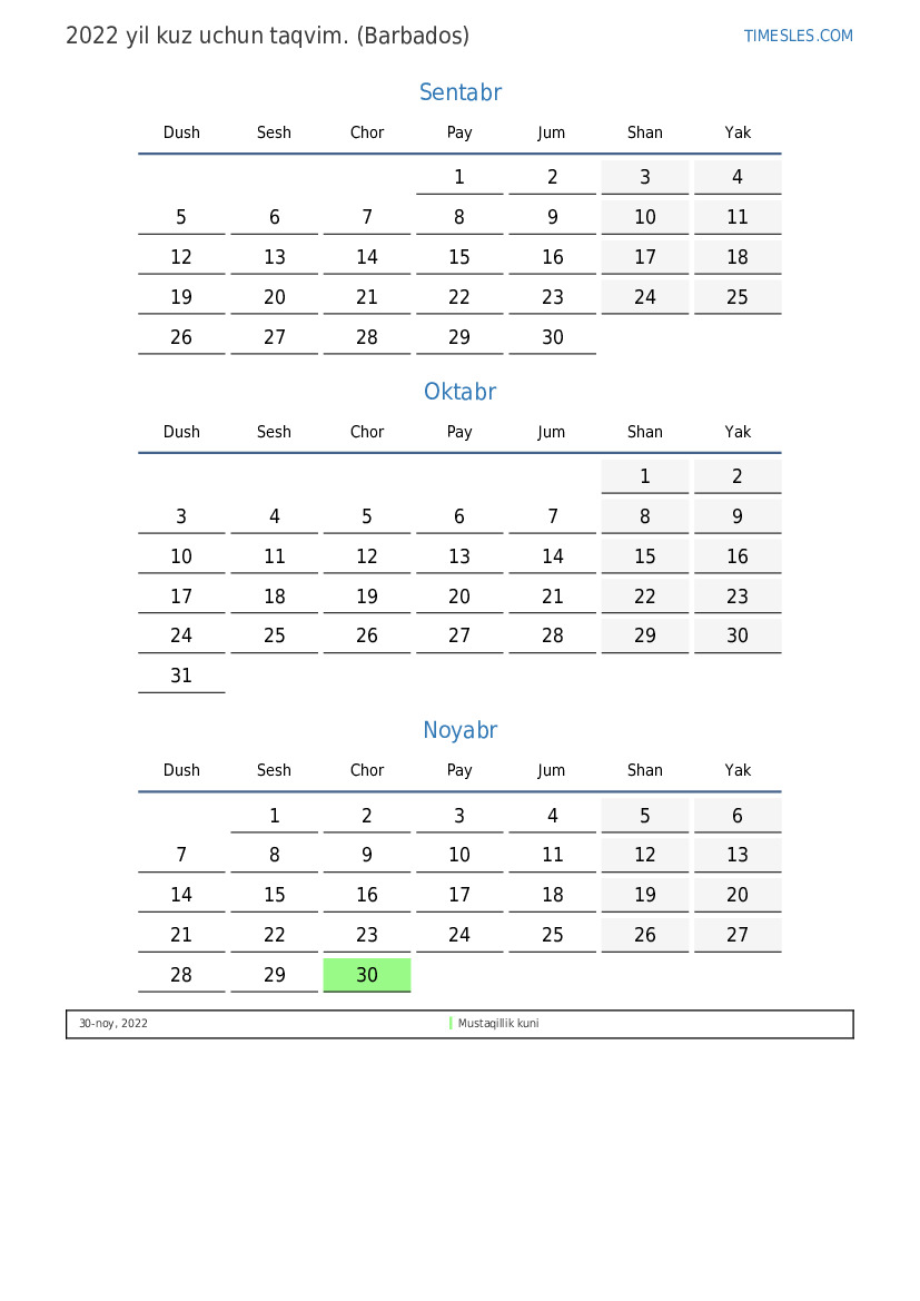 Barbados uchun 2022 yil kuz uchun ta'til va dam olish kunlari bilan PDF taqvimini yuklab oling va chop eting