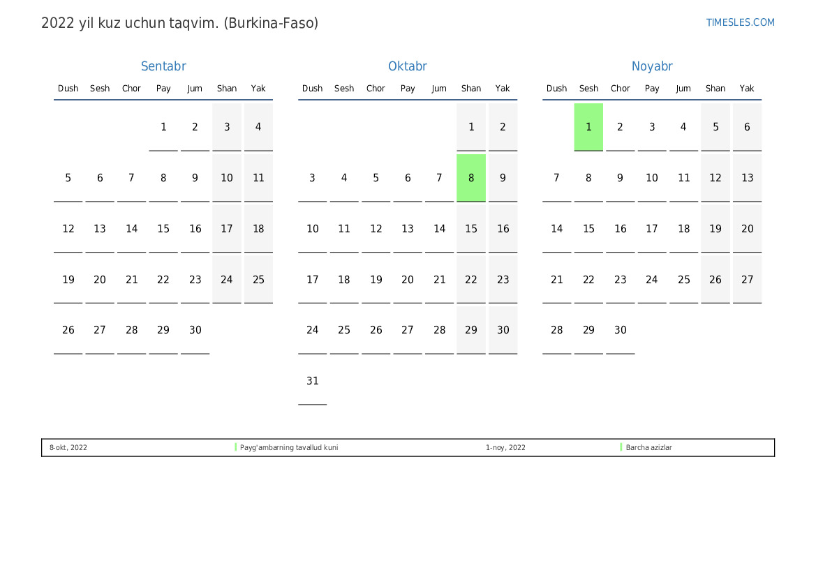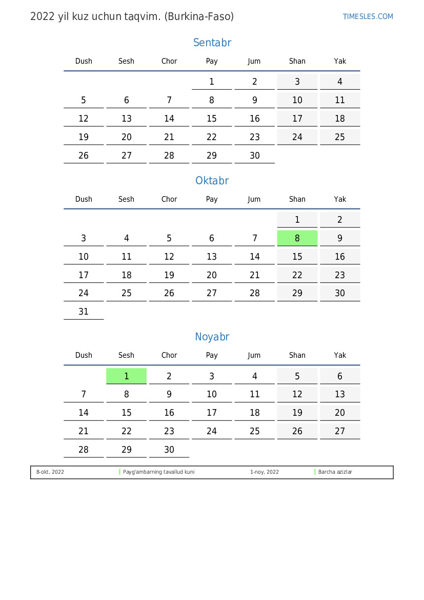Burkina-Faso uchun 2022 yil kuz uchun ta'til va dam olish kunlari taqvimi