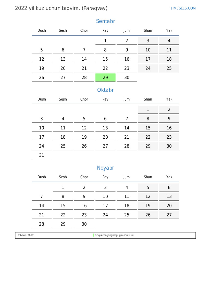 Paragvay uchun 2022 yil kuz uchun ta'til va dam olish kunlari taqvimi