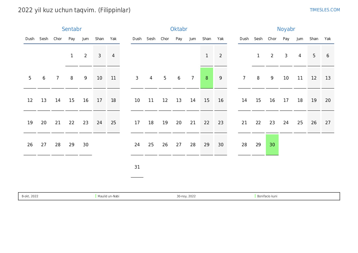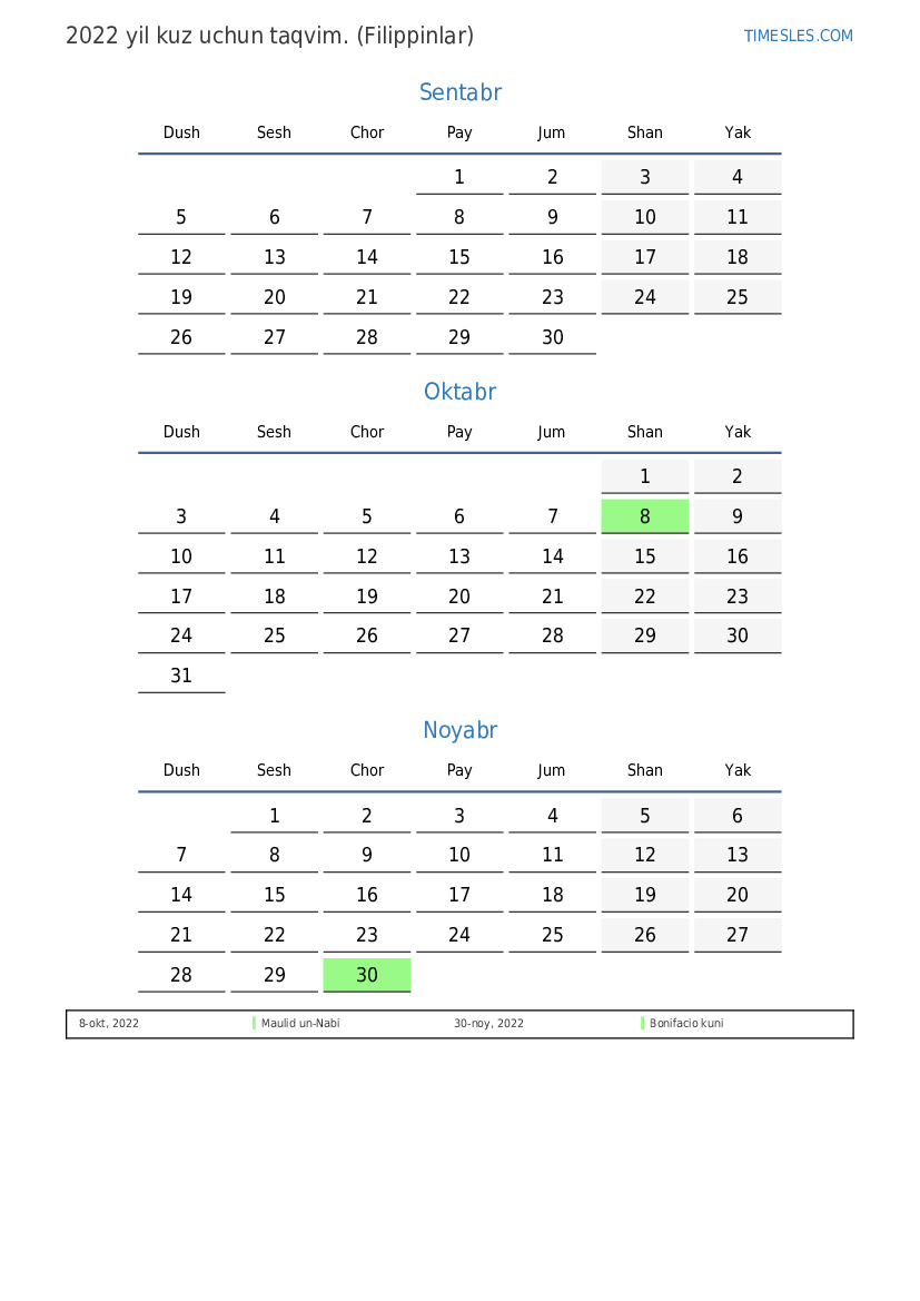 Filippin uchun 2022 yil kuz uchun ta'til va dam olish kunlari taqvimi