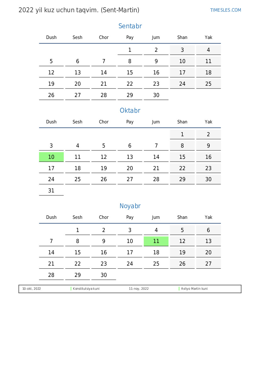 Sint Marten uchun 2022 yil kuz uchun ta'til va dam olish kunlari taqvimi
