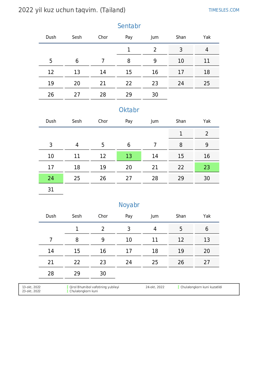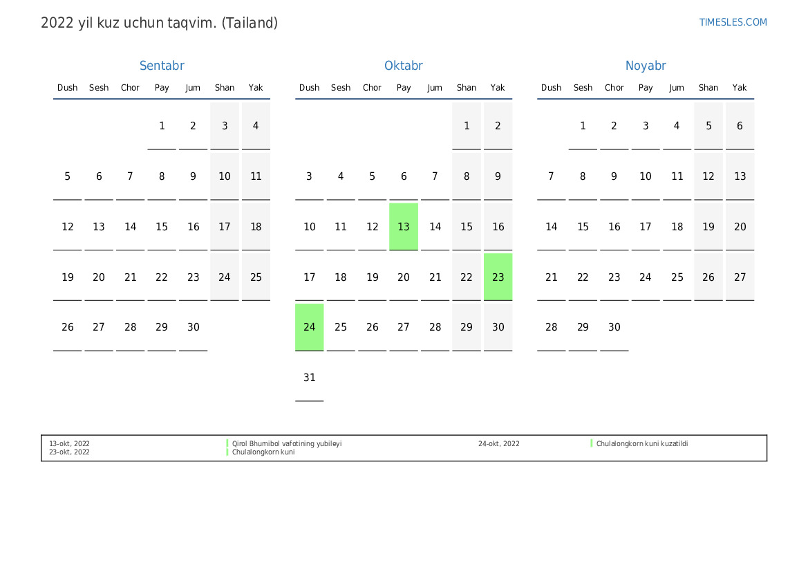 Tailand uchun 2022 yil kuz uchun ta'til va dam olish kunlari taqvimi