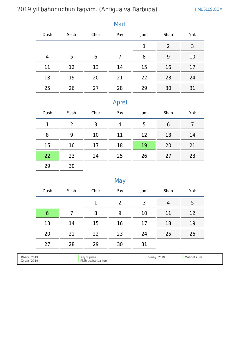 Antigua va Barbuda uchun 2019 yilgi bahor uchun taqvim