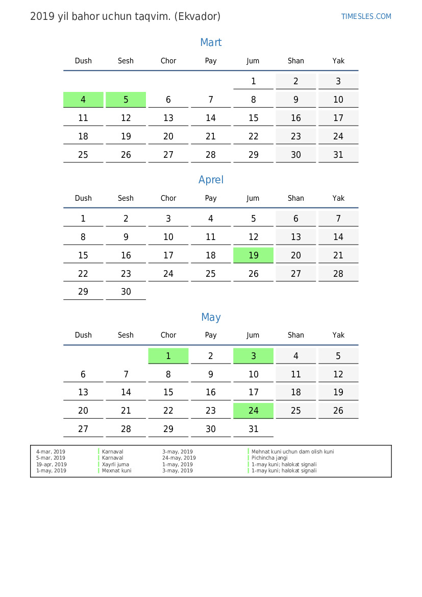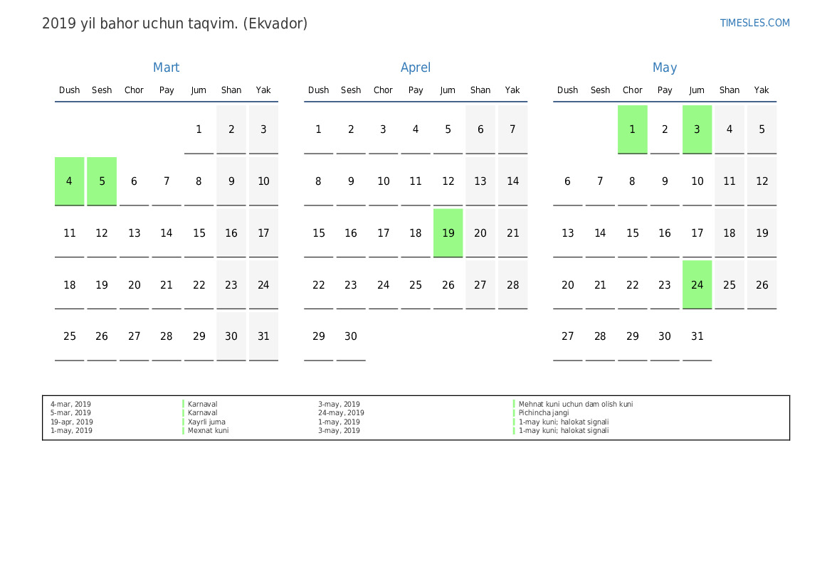 3-may, 2019 Mehnat kuni uchun dam olish kuni