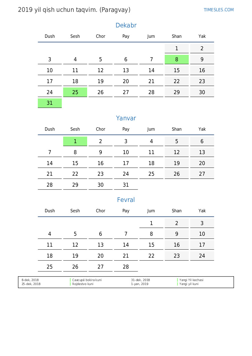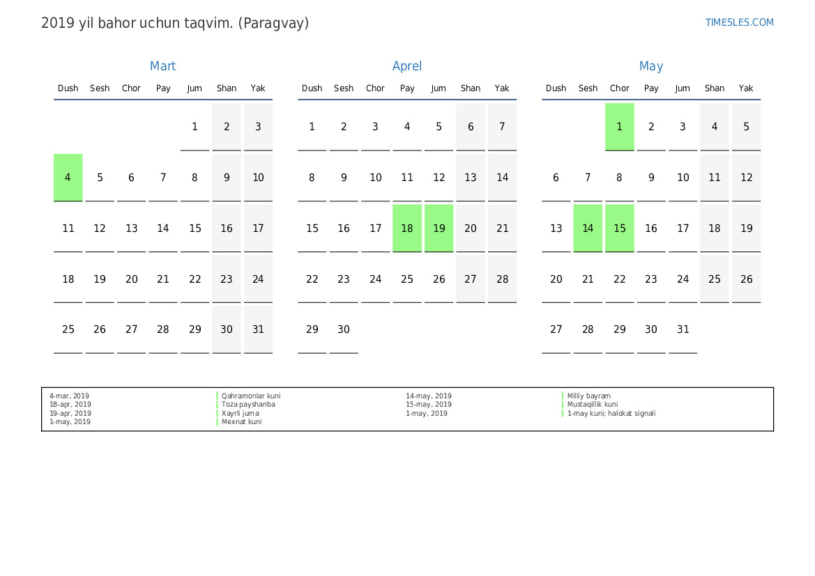 Paragvay uchun 2019 yilgi bahor uchun taqvim