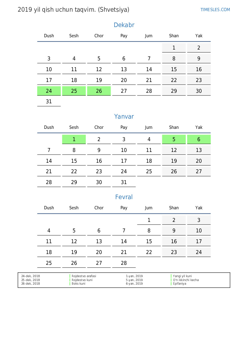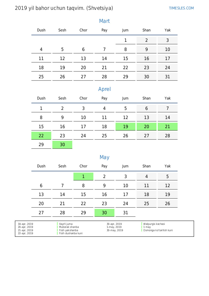 Shvetsiya uchun 2019 yilgi bahor uchun taqvim