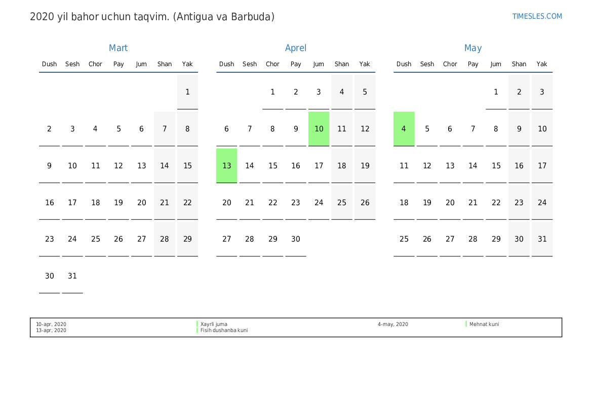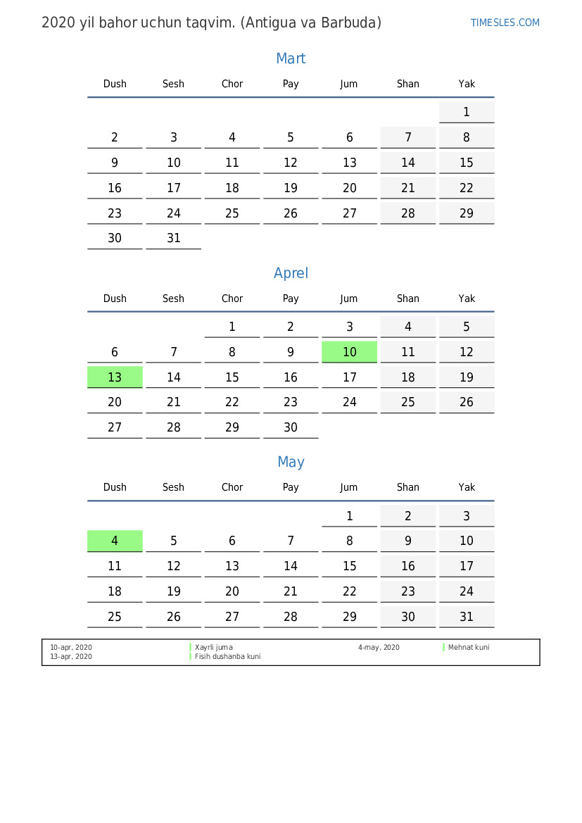 Antigua va Barbuda uchun 2020 yilgi bahor uchun taqvim
