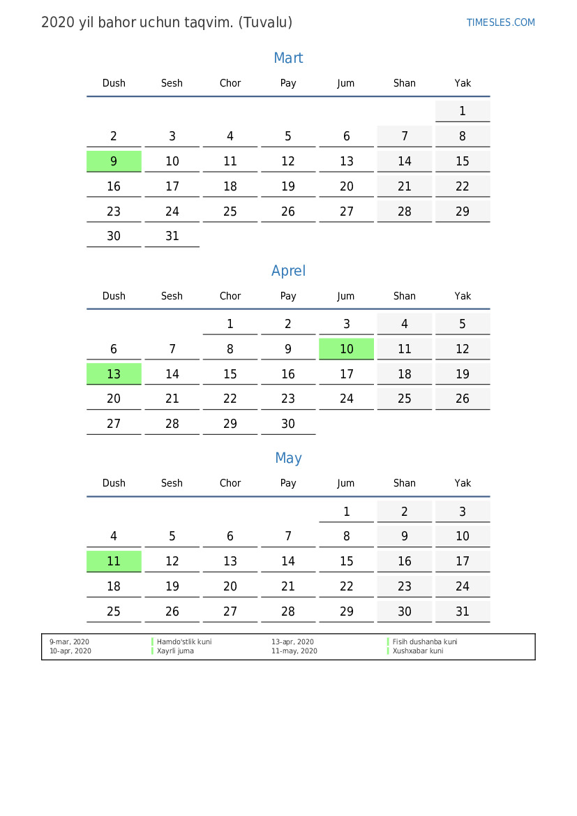 Tuvalu uchun 2020 yilgi bahor uchun taqvim