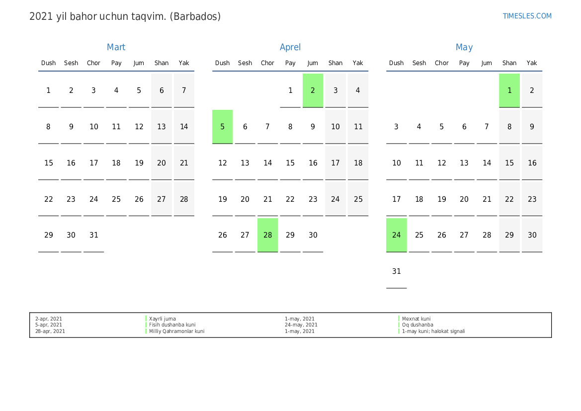 Barbados uchun 2021 yilgi bahor uchun taqvim