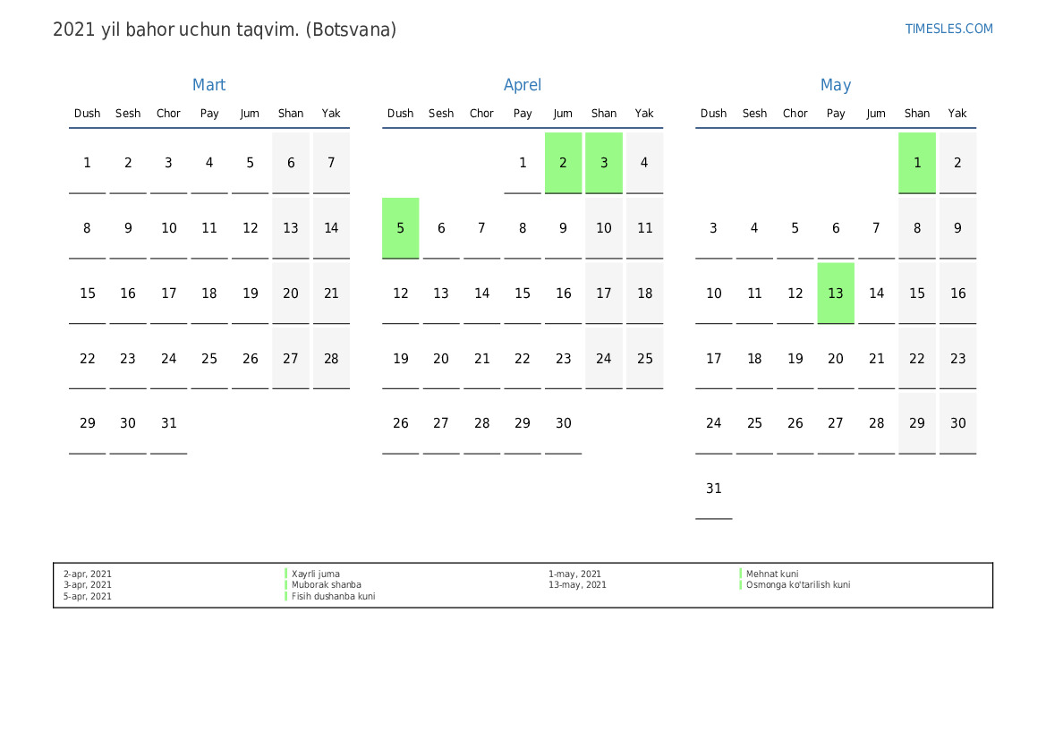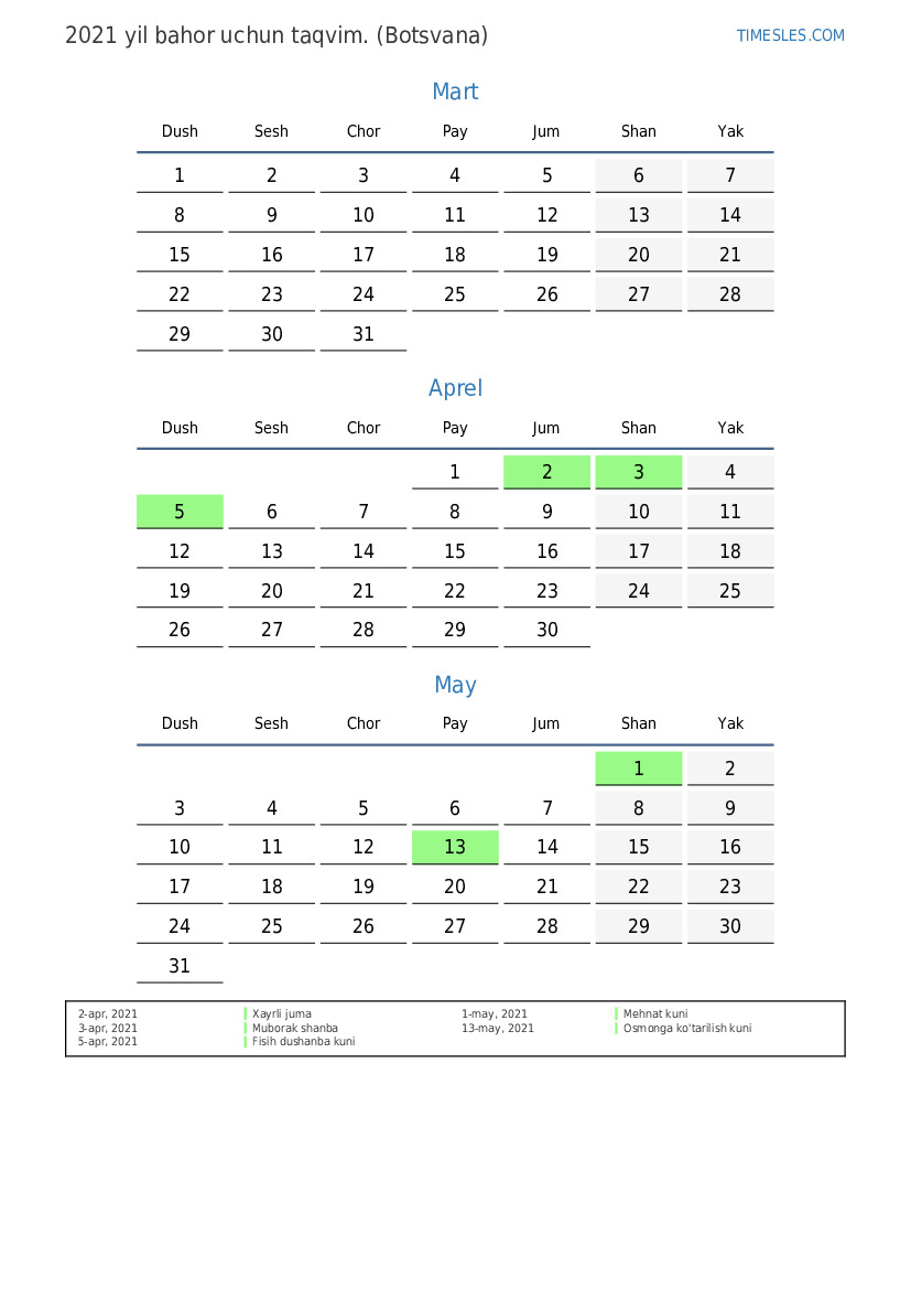 Botsvana uchun 2021 yil bahor uchun ta'til va dam olish kunlari bilan PDF taqvimini yuklab oling va chop eting