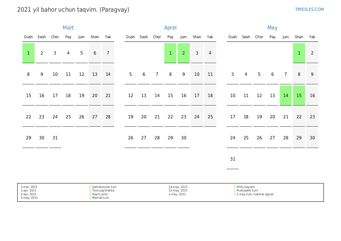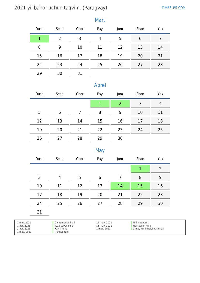 Paragvay uchun 2021 yilgi bahor uchun taqvim