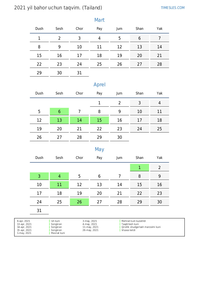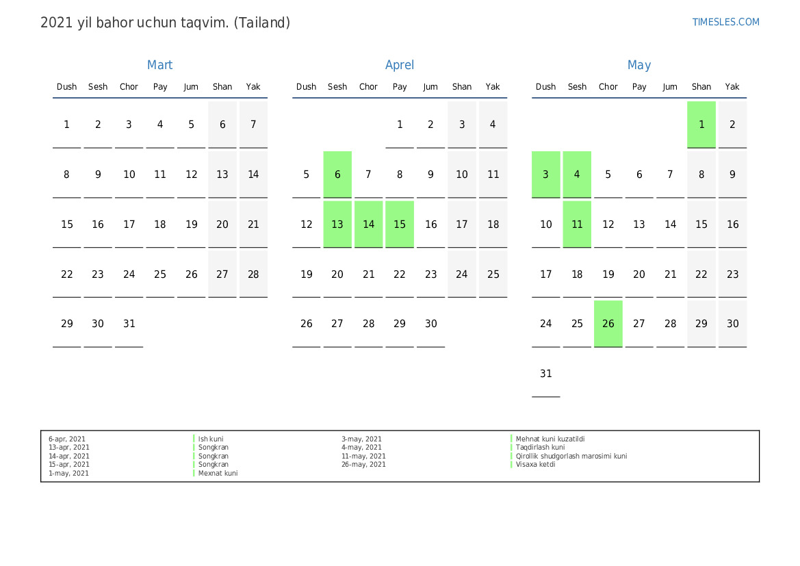 Tailand uchun 2021 yilgi bahor uchun taqvim
