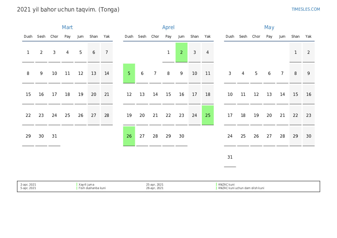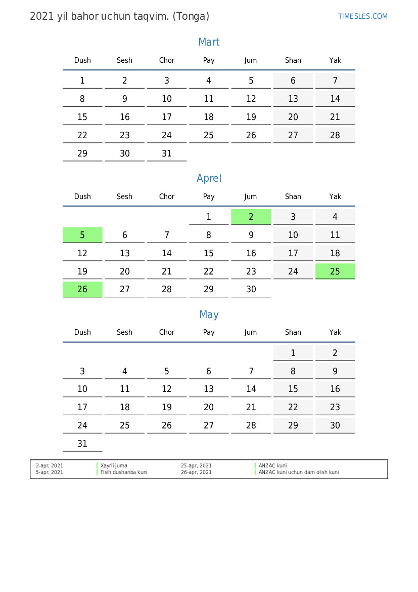 Tonga uchun 2021 yilgi bahor uchun taqvim