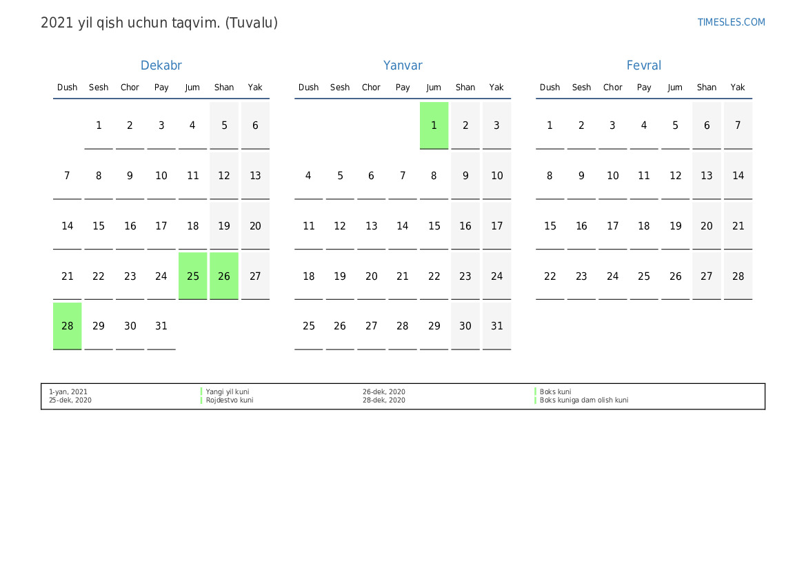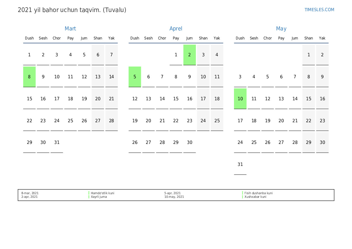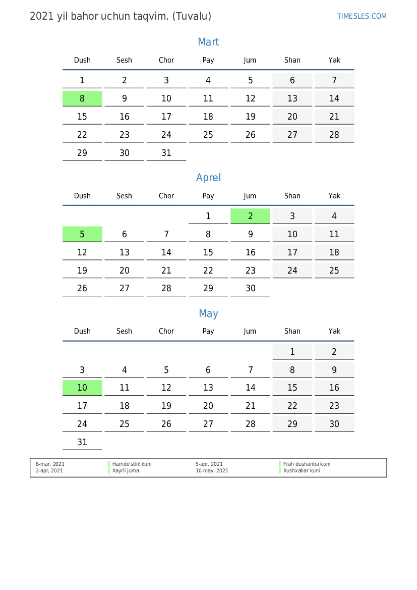 Tuvalu uchun 2021 yil bahor uchun ta'til va dam olish kunlari taqvimi
