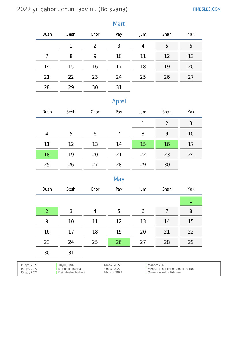 Botsvana uchun 2022 yil bahor uchun ta'til va dam olish kunlari taqvimi