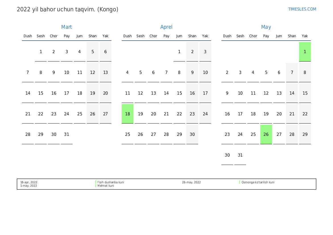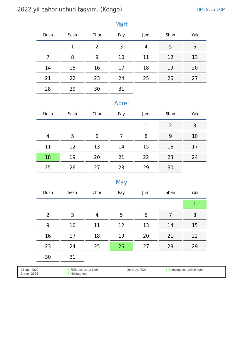 Kongo uchun 2022 yil bahor uchun ta'til va dam olish kunlari taqvimi