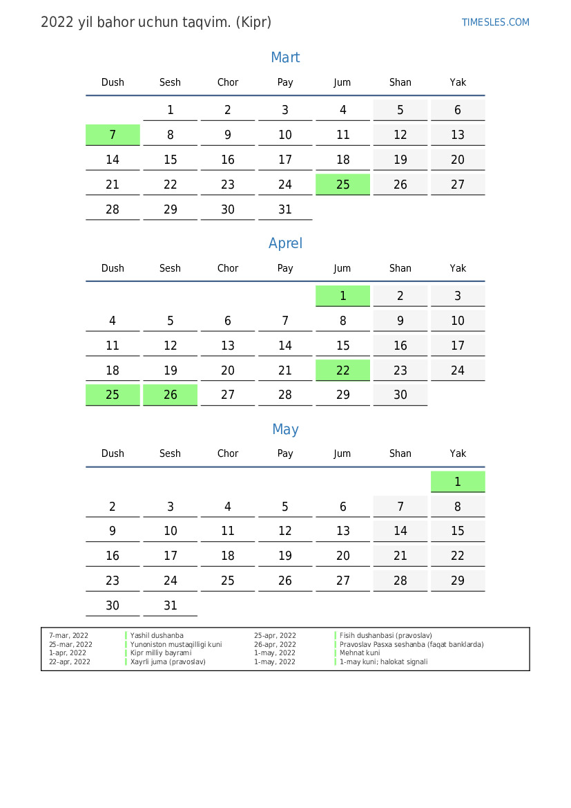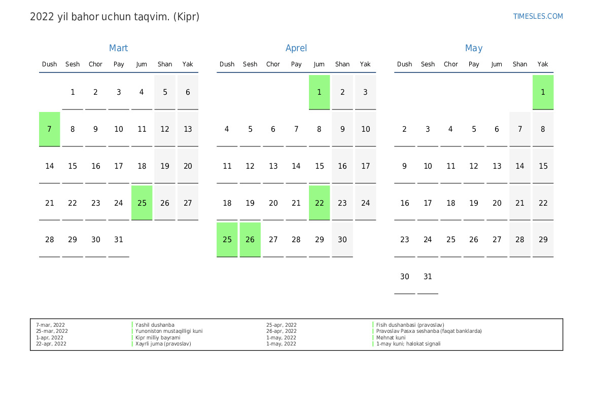 7-mar, 2022 Yashil dushanba