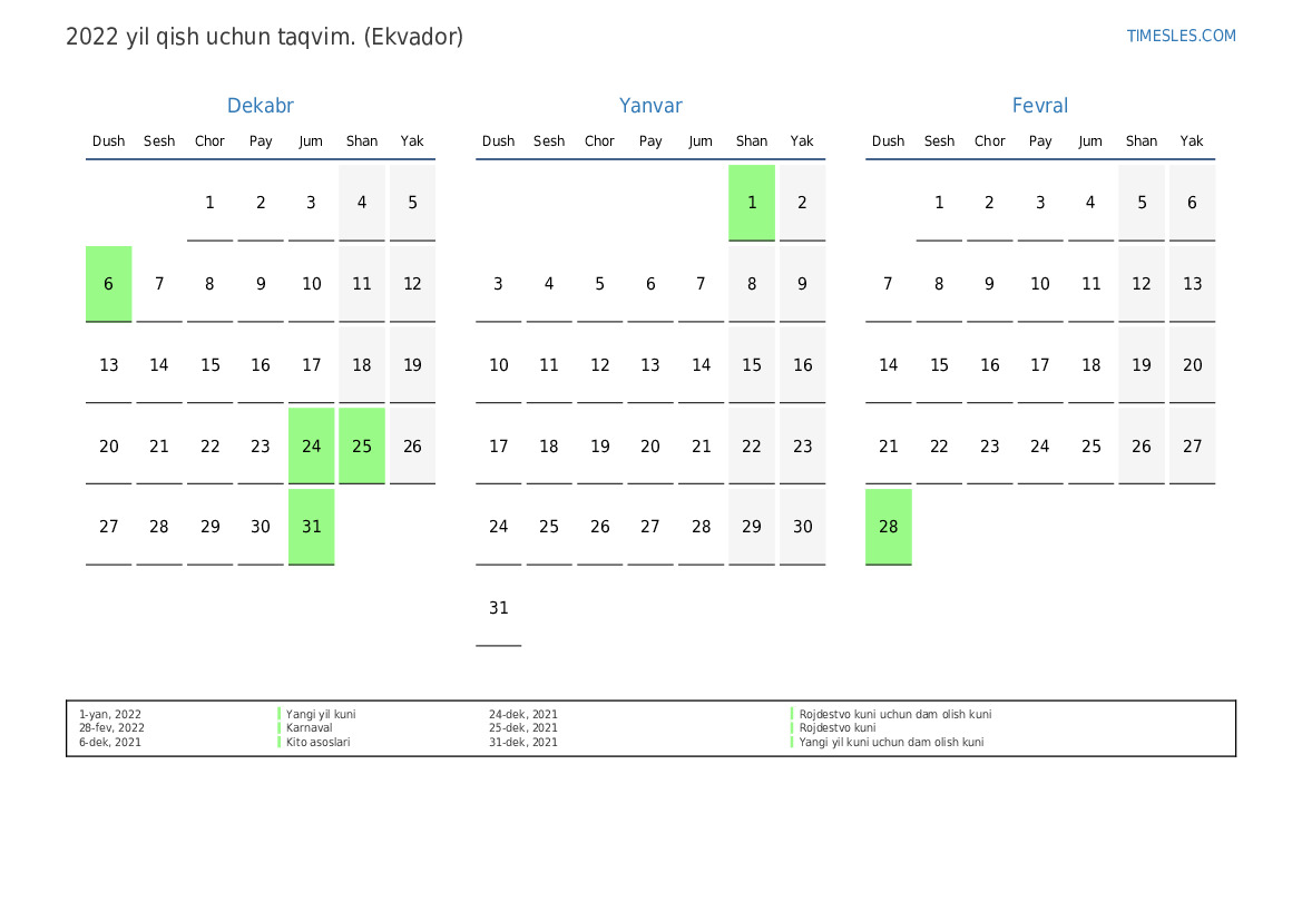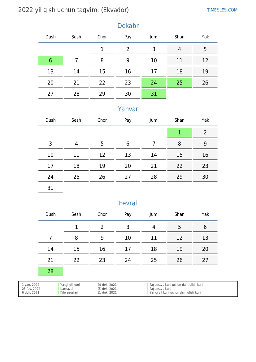 Ekvador uchun 2022 yil bahor uchun ta'til va dam olish kunlari taqvimi