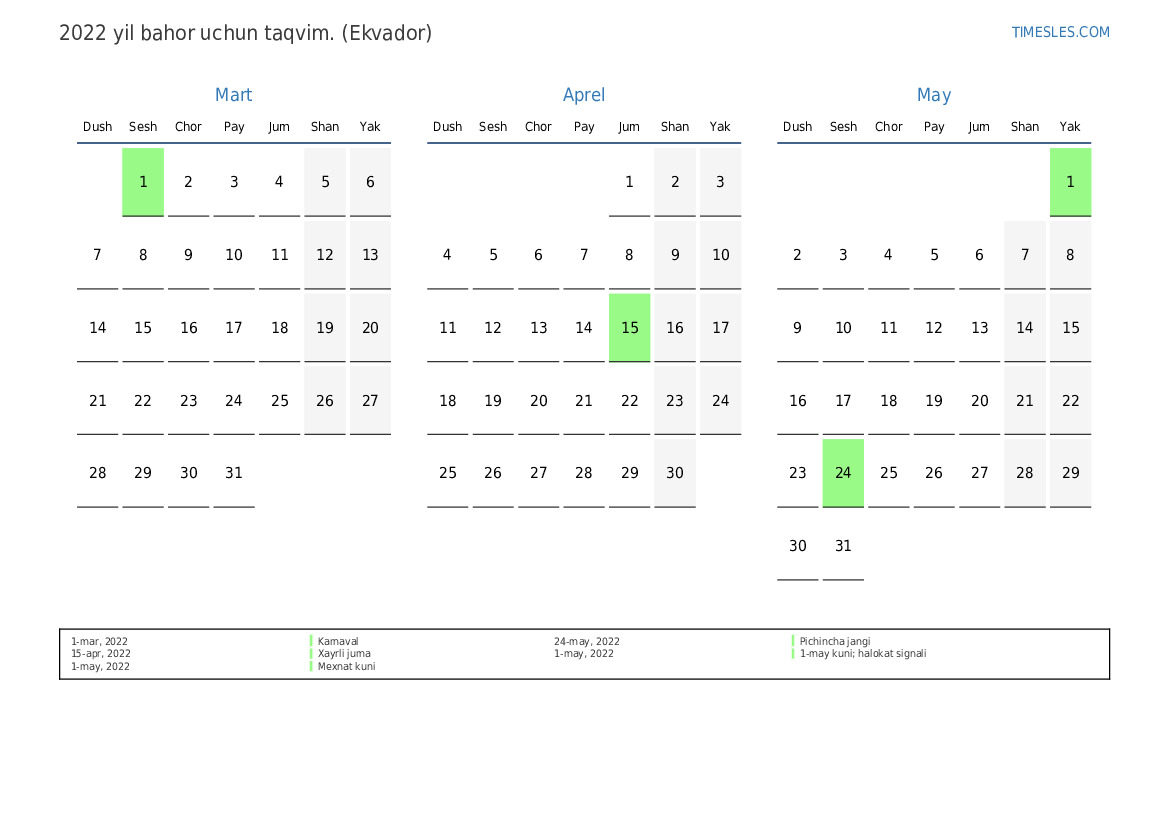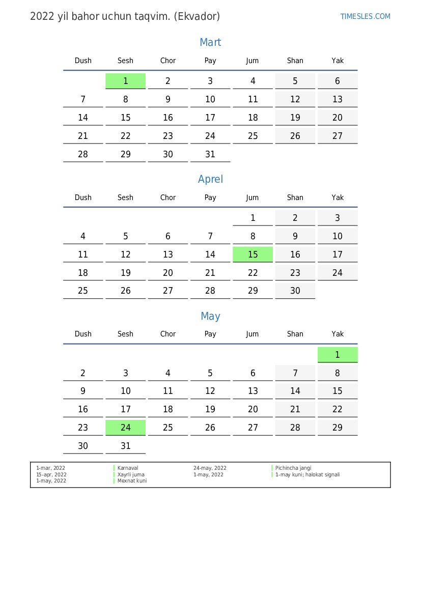 Ekvador uchun 2022 yilgi bahor uchun taqvim