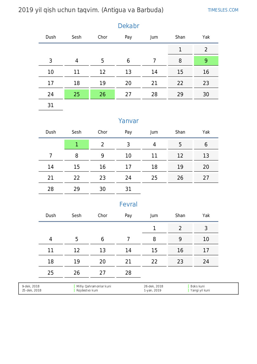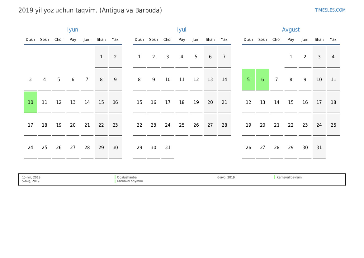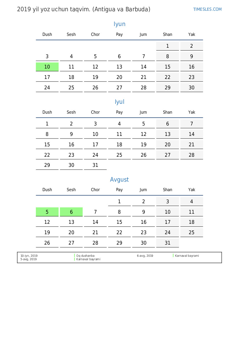 Antigua va Barbuda uchun 2019 yilgi yoz uchun taqvim