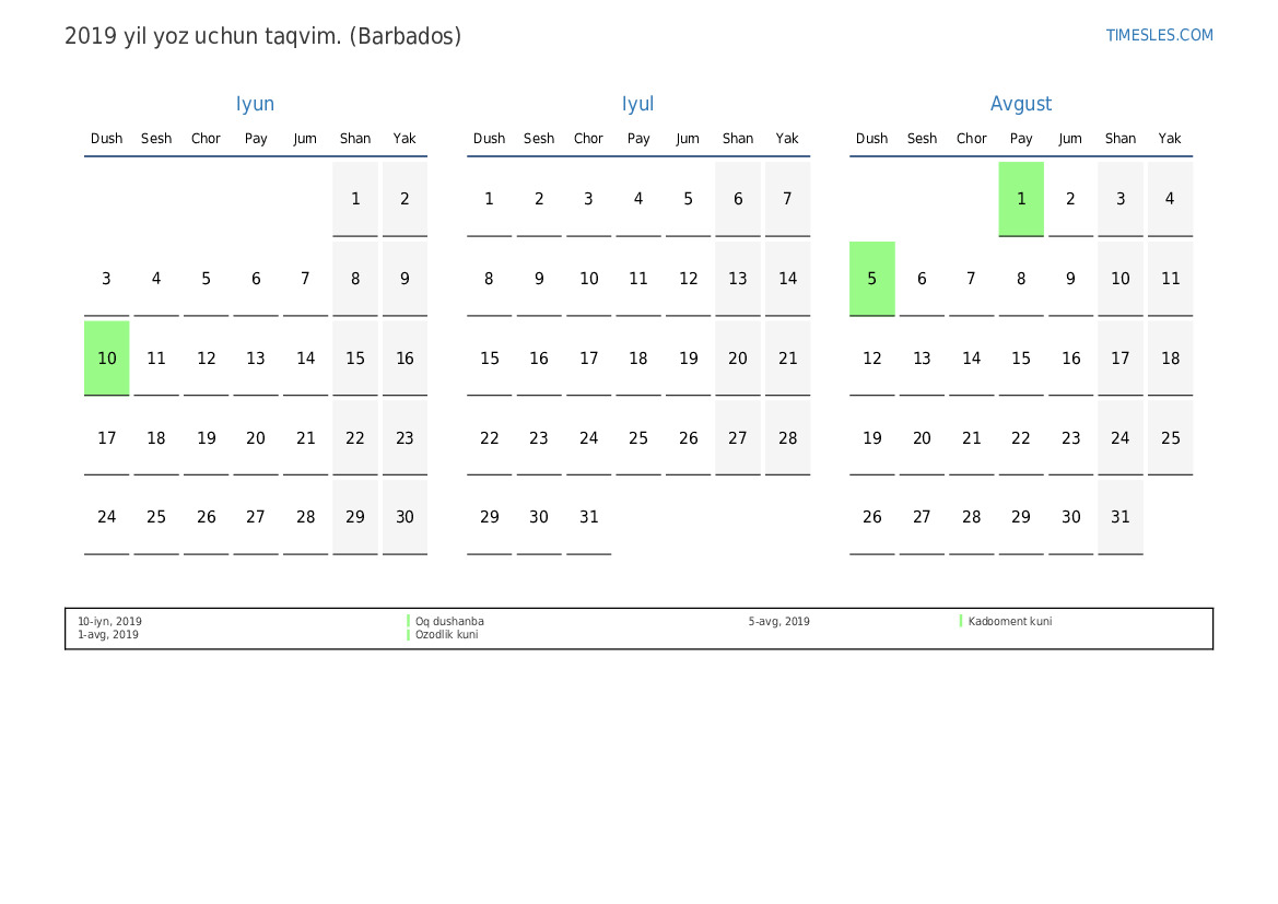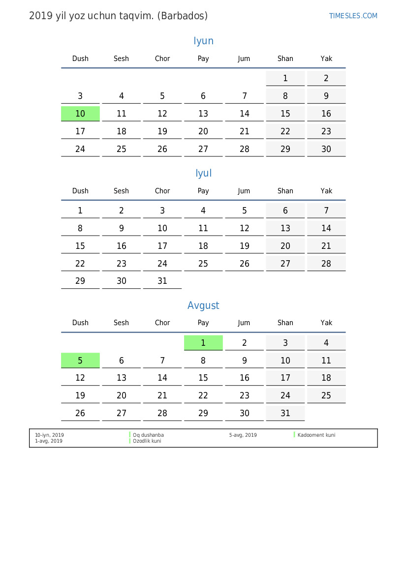 Barbados uchun 2019 yilgi yoz uchun taqvim