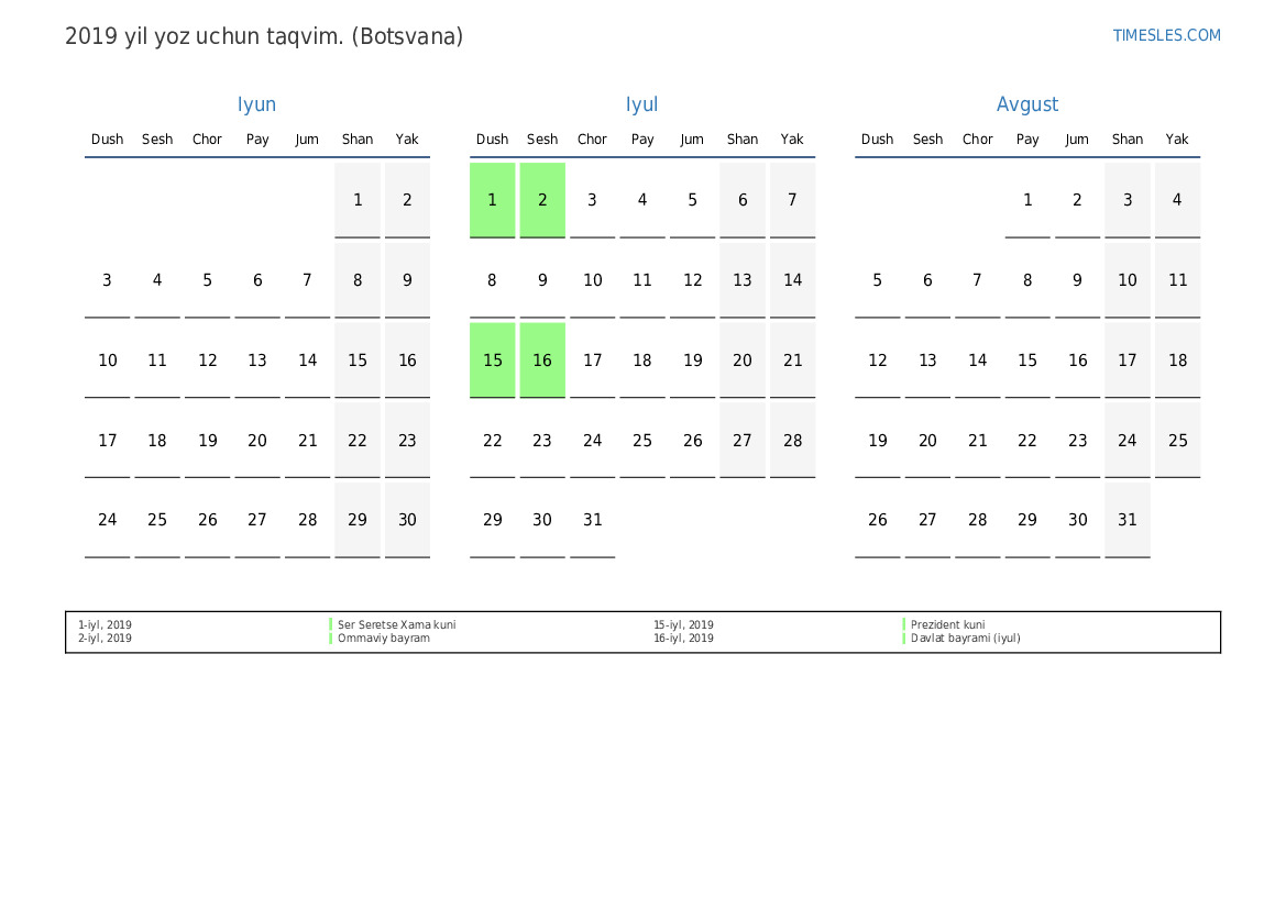 Botsvana uchun 2019 yil yoz uchun ta'til va dam olish kunlari bilan PDF taqvimini yuklab oling va chop eting