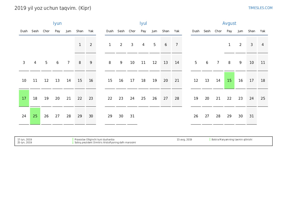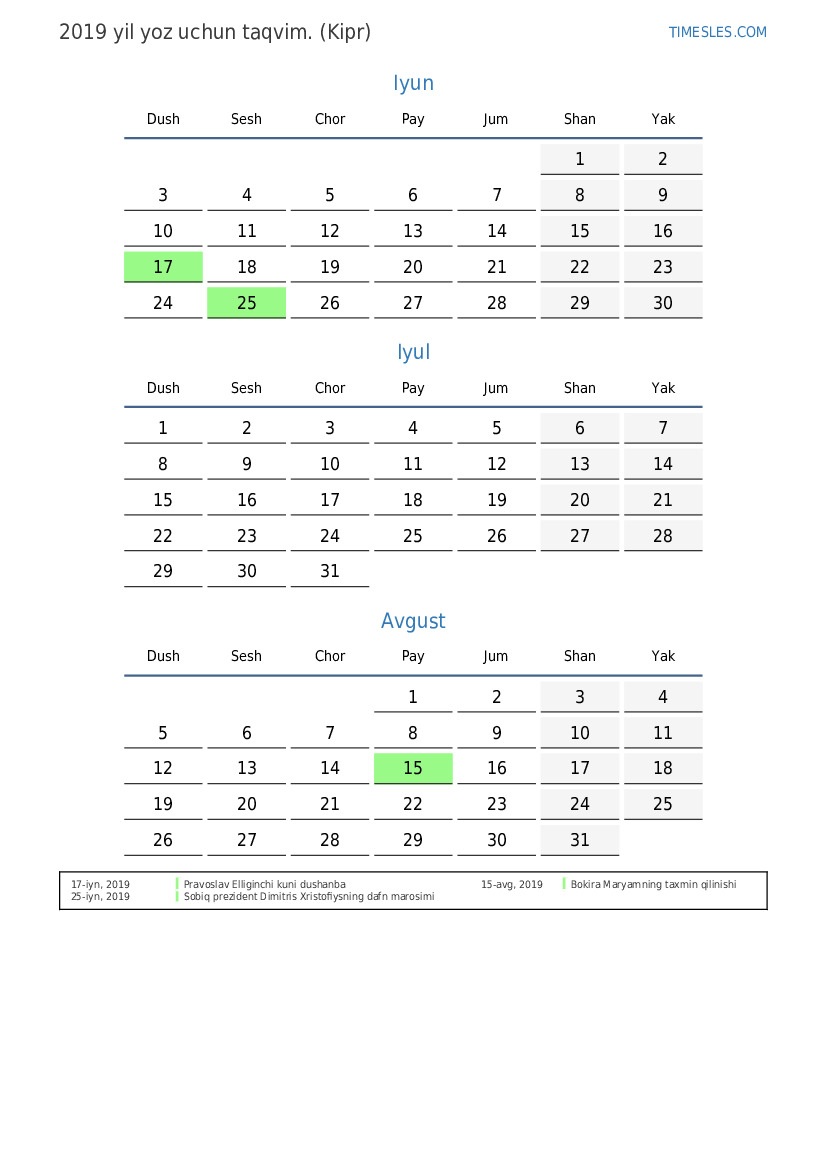 Kipr uchun 2019 yilgi yoz uchun taqvim