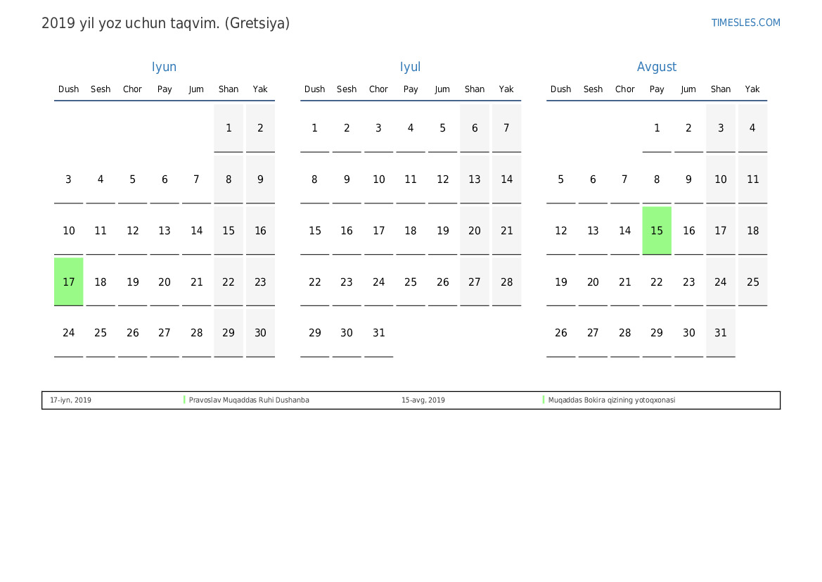 Gretsiya uchun 2019 yil yoz uchun ta'til va dam olish kunlari taqvimi