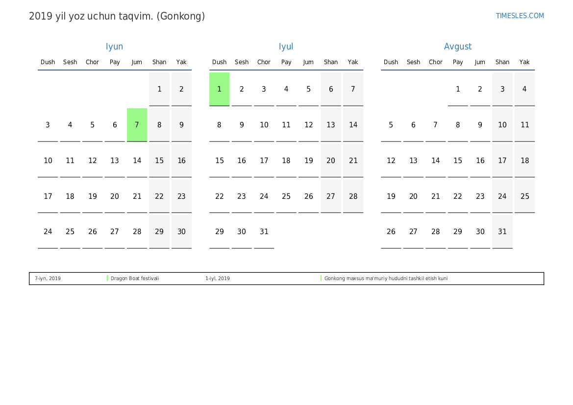 Gonkong uchun 2019 yilgi yoz uchun taqvim