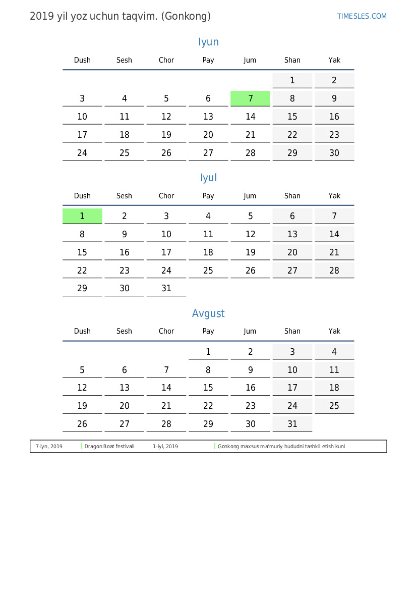 Gonkong uchun 2019 yil yoz uchun ta'til va dam olish kunlari bilan PDF taqvimini yuklab oling va chop eting