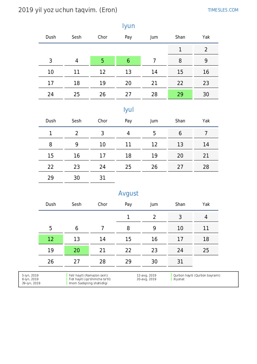 Eron uchun 2019 yilgi yoz uchun taqvim