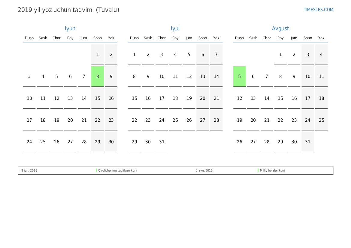 Tuvalu uchun 2019 yil yoz uchun ta'til va dam olish kunlari taqvimi