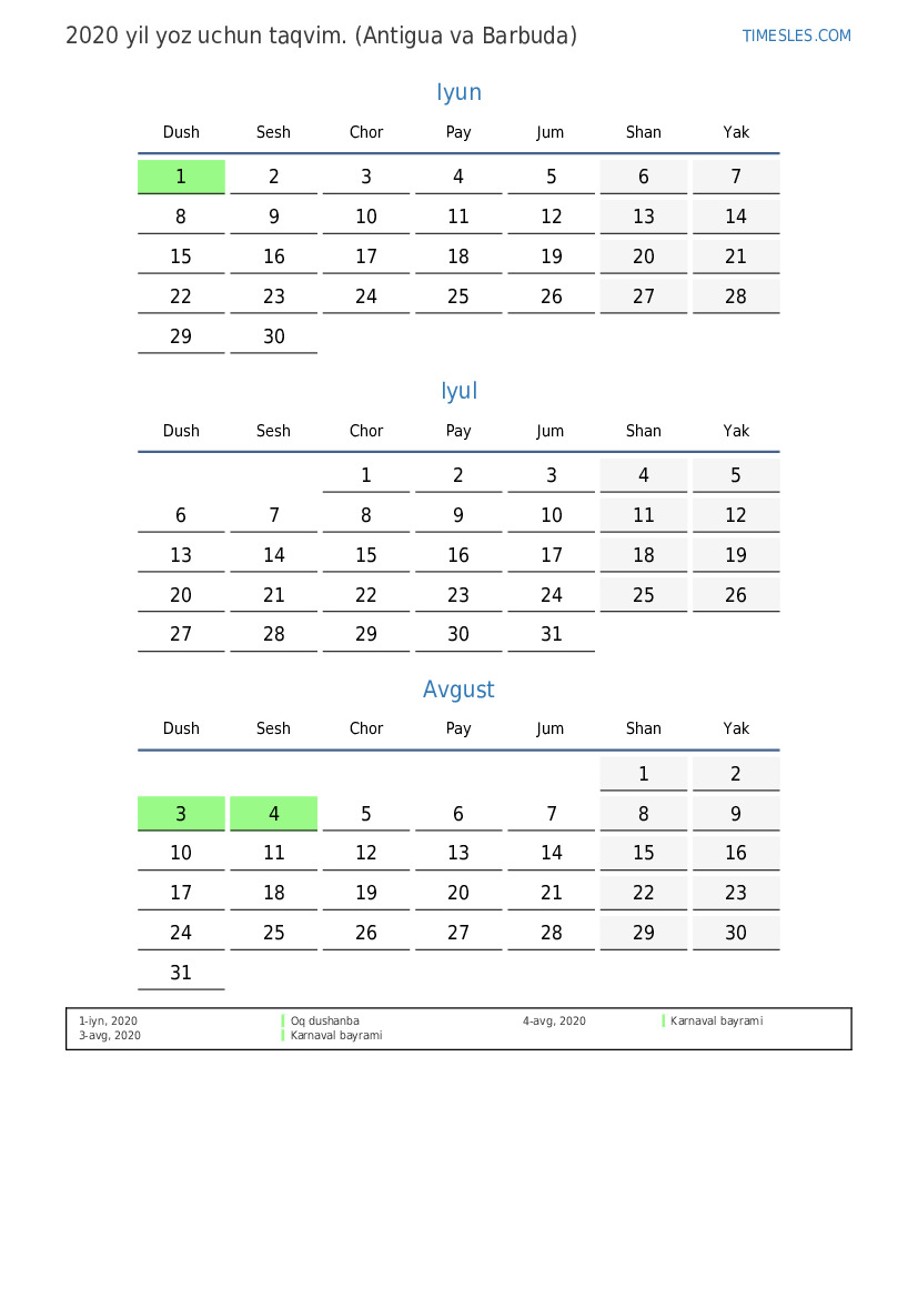 Antigua va Barbuda uchun 2020 yilgi yoz uchun taqvim