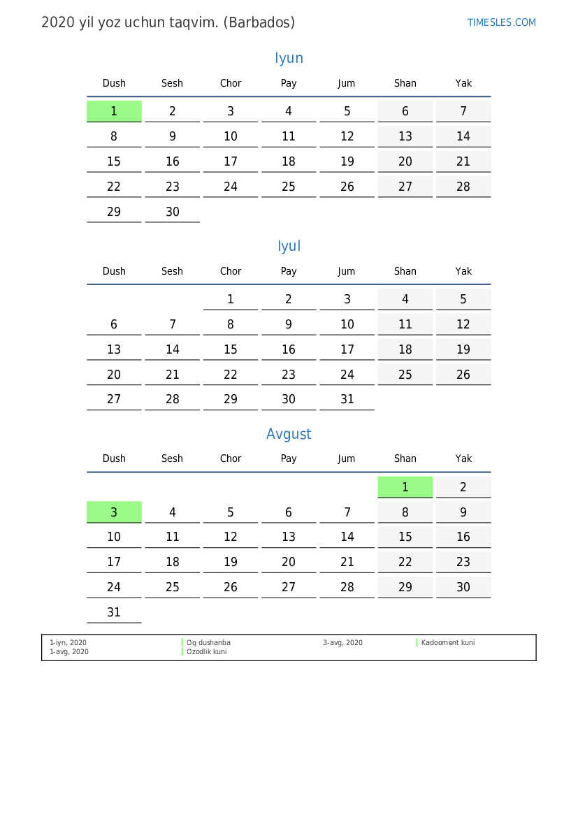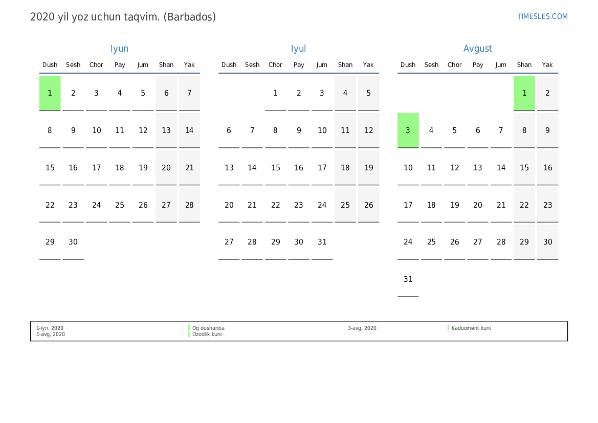 Barbados uchun 2020 yil yoz uchun ta'til va dam olish kunlari taqvimi