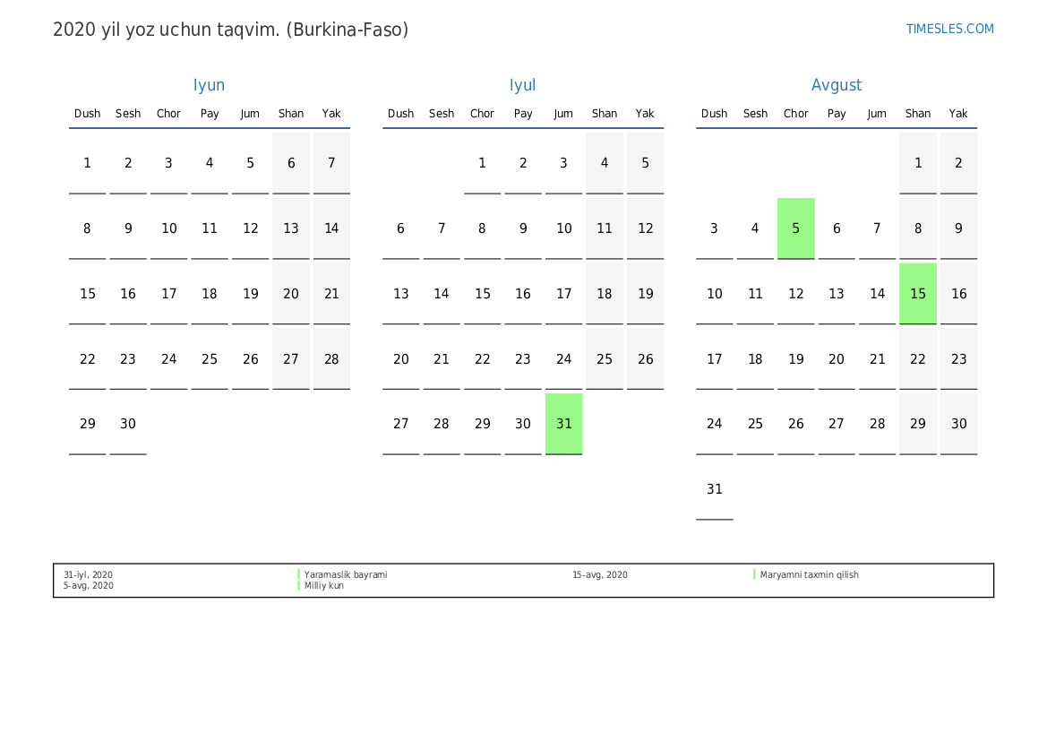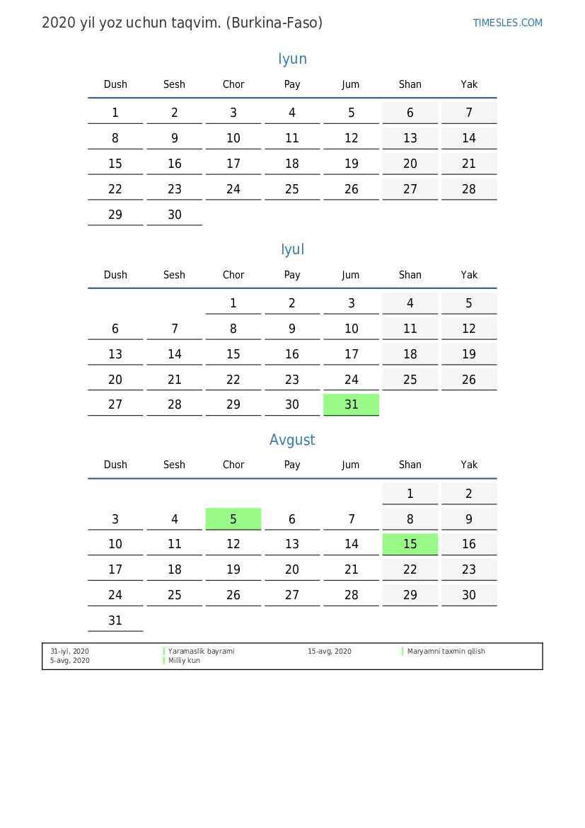 Burkina-Faso uchun 2020 yilgi yoz uchun taqvim