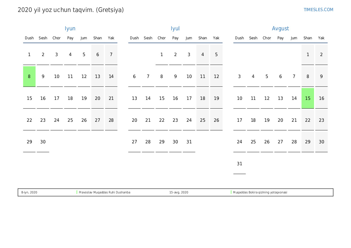 Gretsiya uchun 2020 yilgi yoz uchun taqvim
