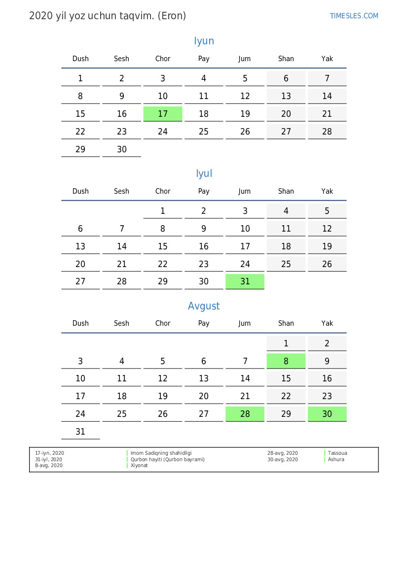 Eron uchun 2020 yil yoz uchun ta'til va dam olish kunlari taqvimi