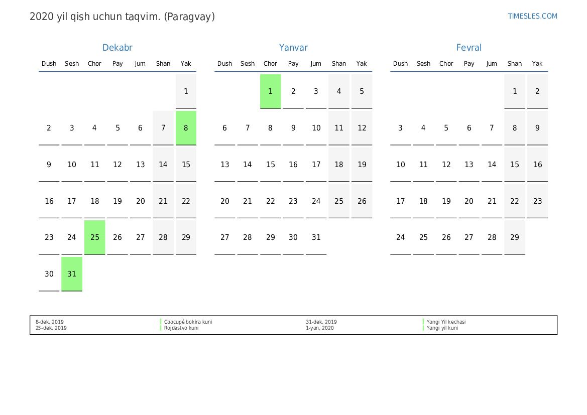 Paragvay uchun 2020 yilgi yoz uchun taqvim