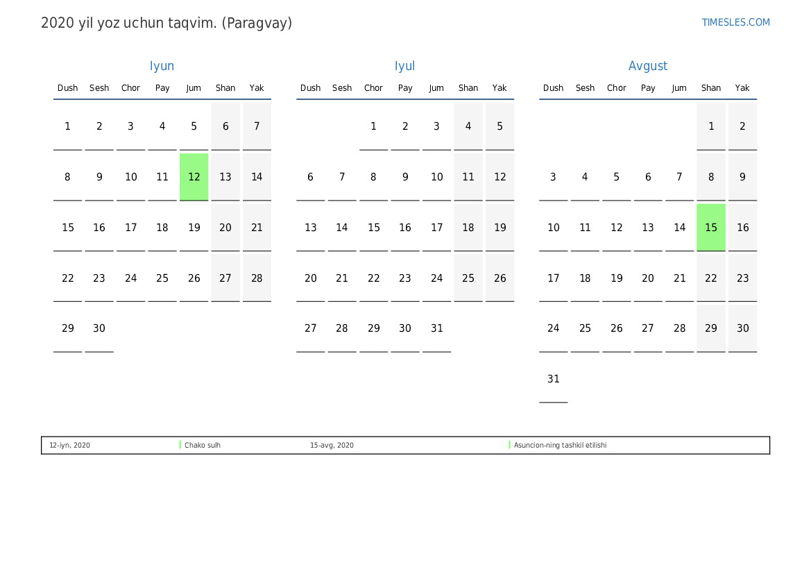 Paragvay uchun 2020 yil yoz uchun ta'til va dam olish kunlari taqvimi