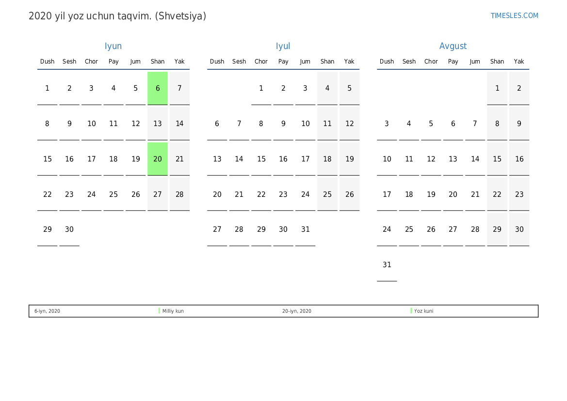 Shvetsiya uchun 2020 yilgi yoz uchun taqvim