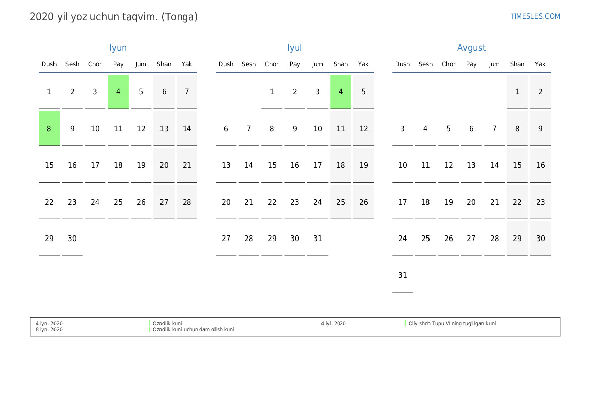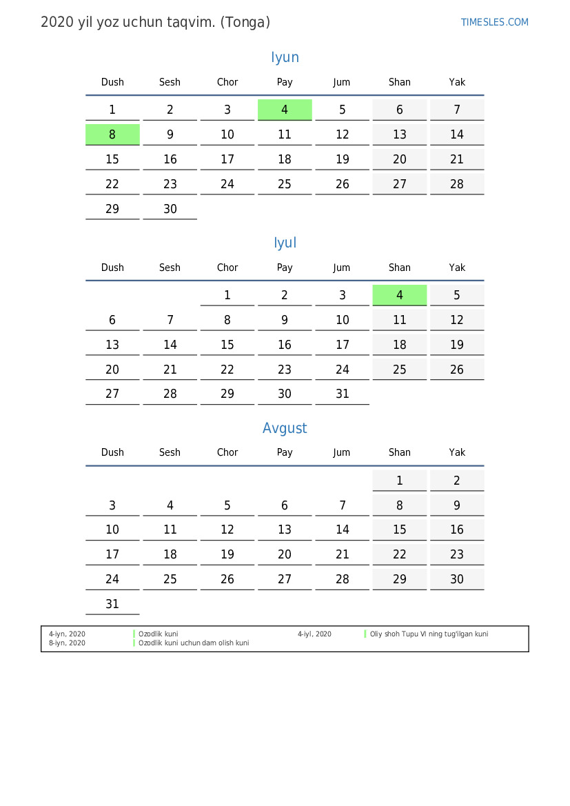 Tonga uchun 2020 yil yoz uchun ta'til va dam olish kunlari bilan PDF taqvimini yuklab oling va chop eting