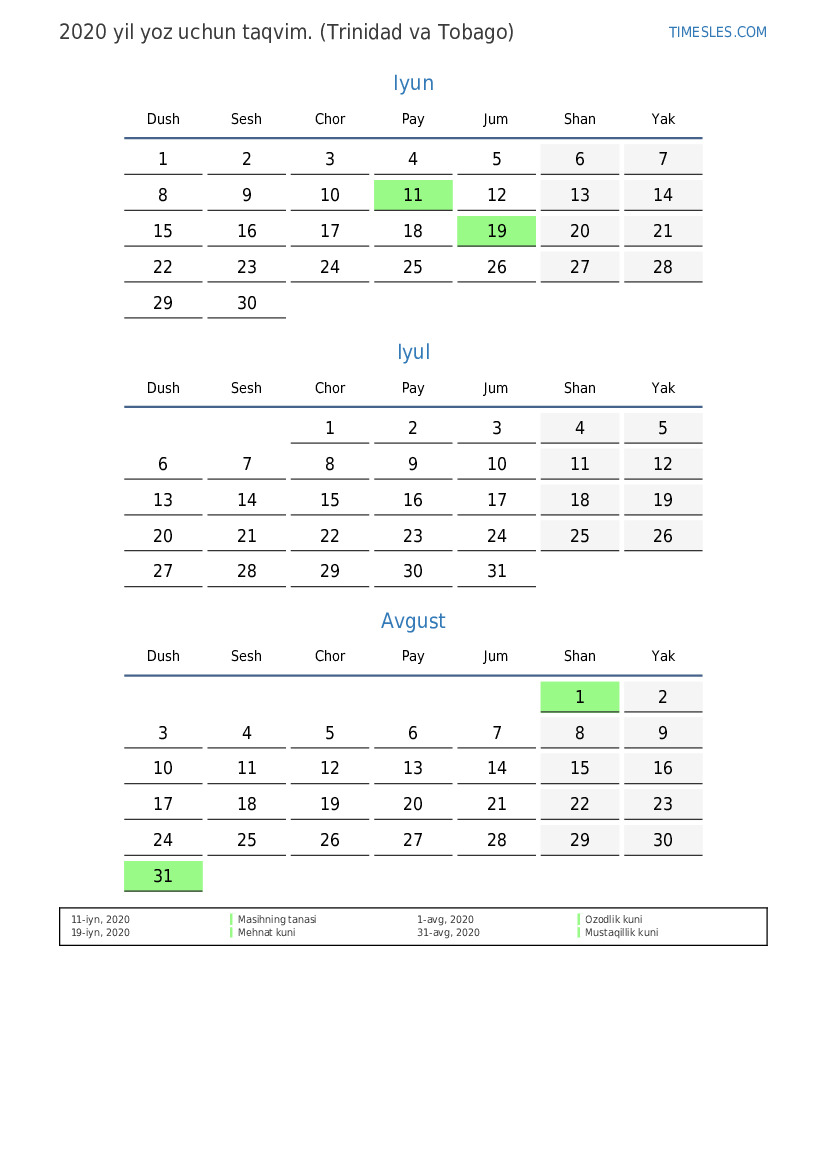 Trinidad va Tobago uchun 2020 yilgi yoz uchun taqvim