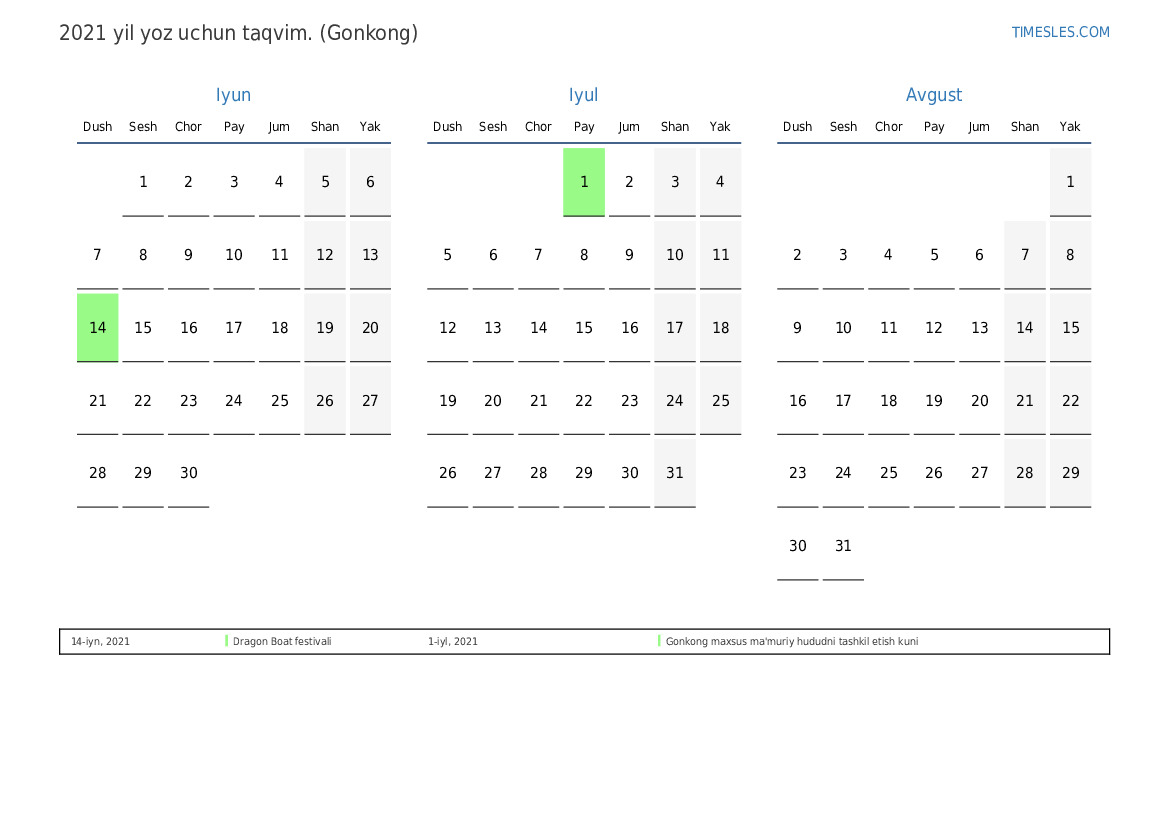 Gonkong uchun 2021 yil yoz uchun ta'til va dam olish kunlari bilan PDF taqvimini yuklab oling va chop eting
