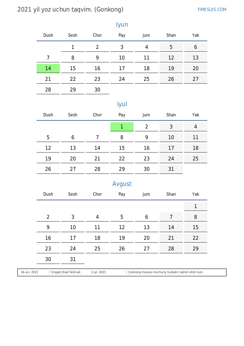 Gonkong uchun 2021 yilgi yoz uchun taqvim
