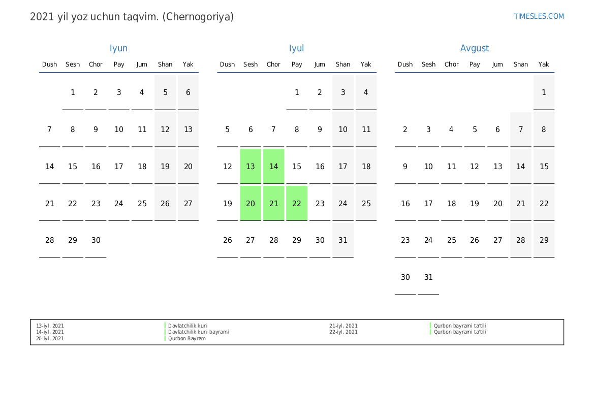 Chernogoriya uchun 2021 yilgi yoz uchun taqvim