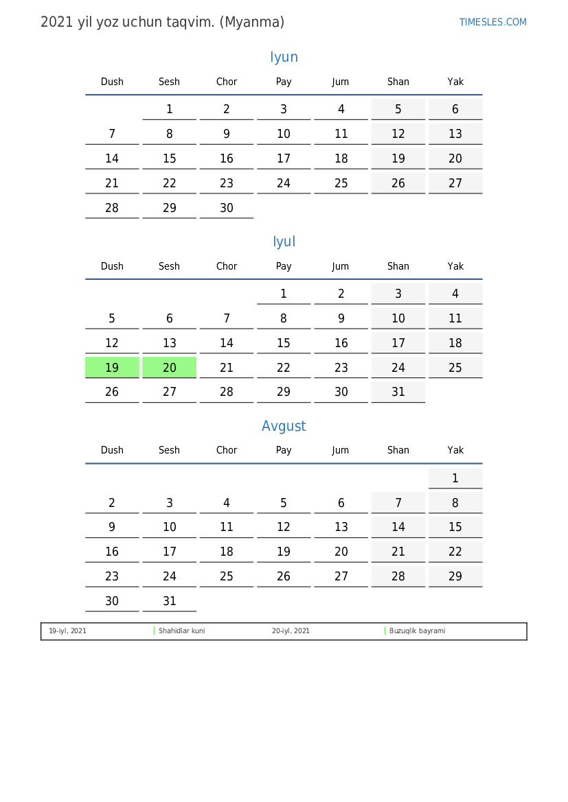 Myanma uchun 2021 yil yoz uchun ta'til va dam olish kunlari bilan PDF taqvimini yuklab oling va chop eting