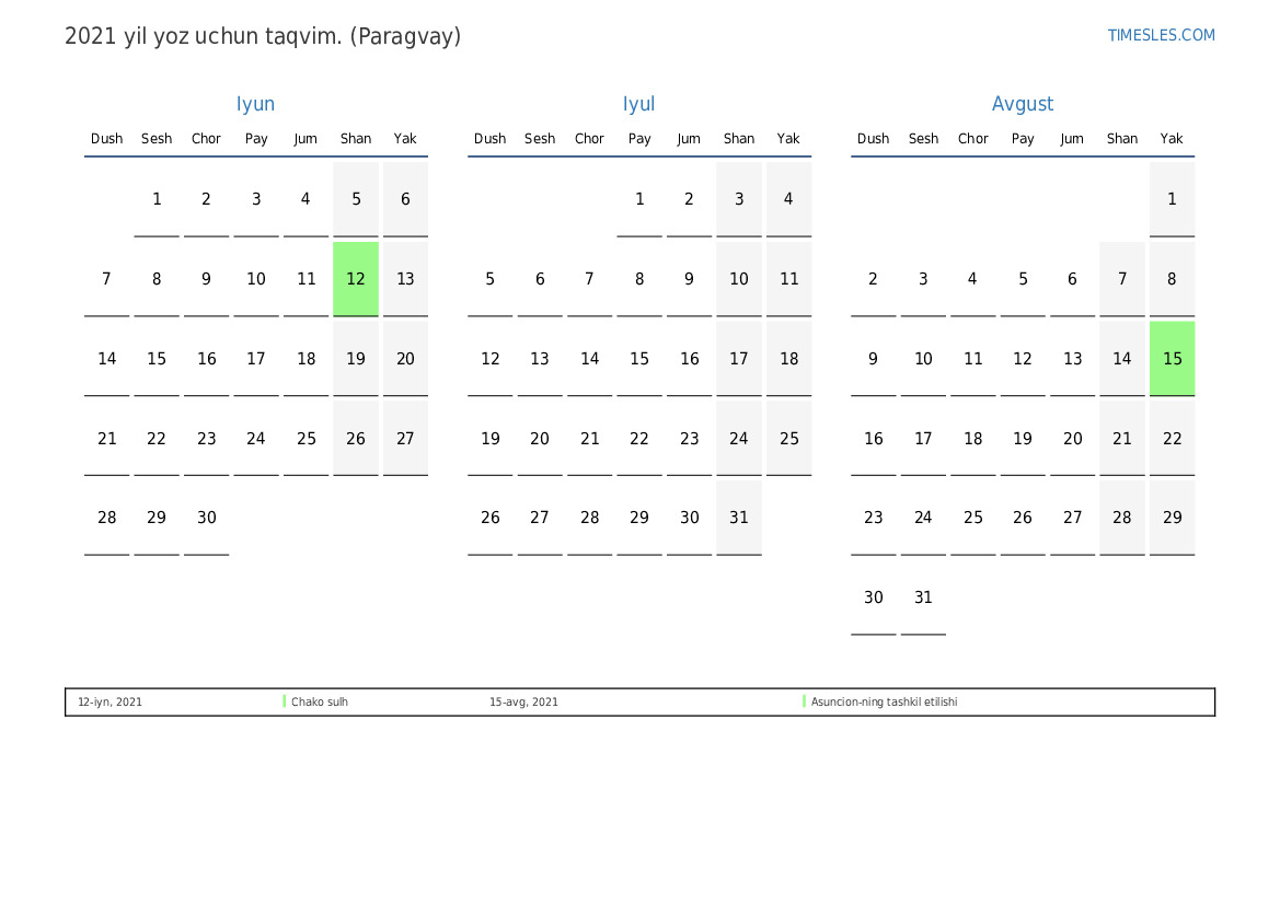 Paragvay uchun 2021 yil yoz uchun ta'til va dam olish kunlari taqvimi