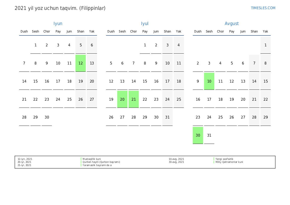 Filippin uchun 2021 yil yoz uchun ta'til va dam olish kunlari bilan PDF taqvimini yuklab oling va chop eting